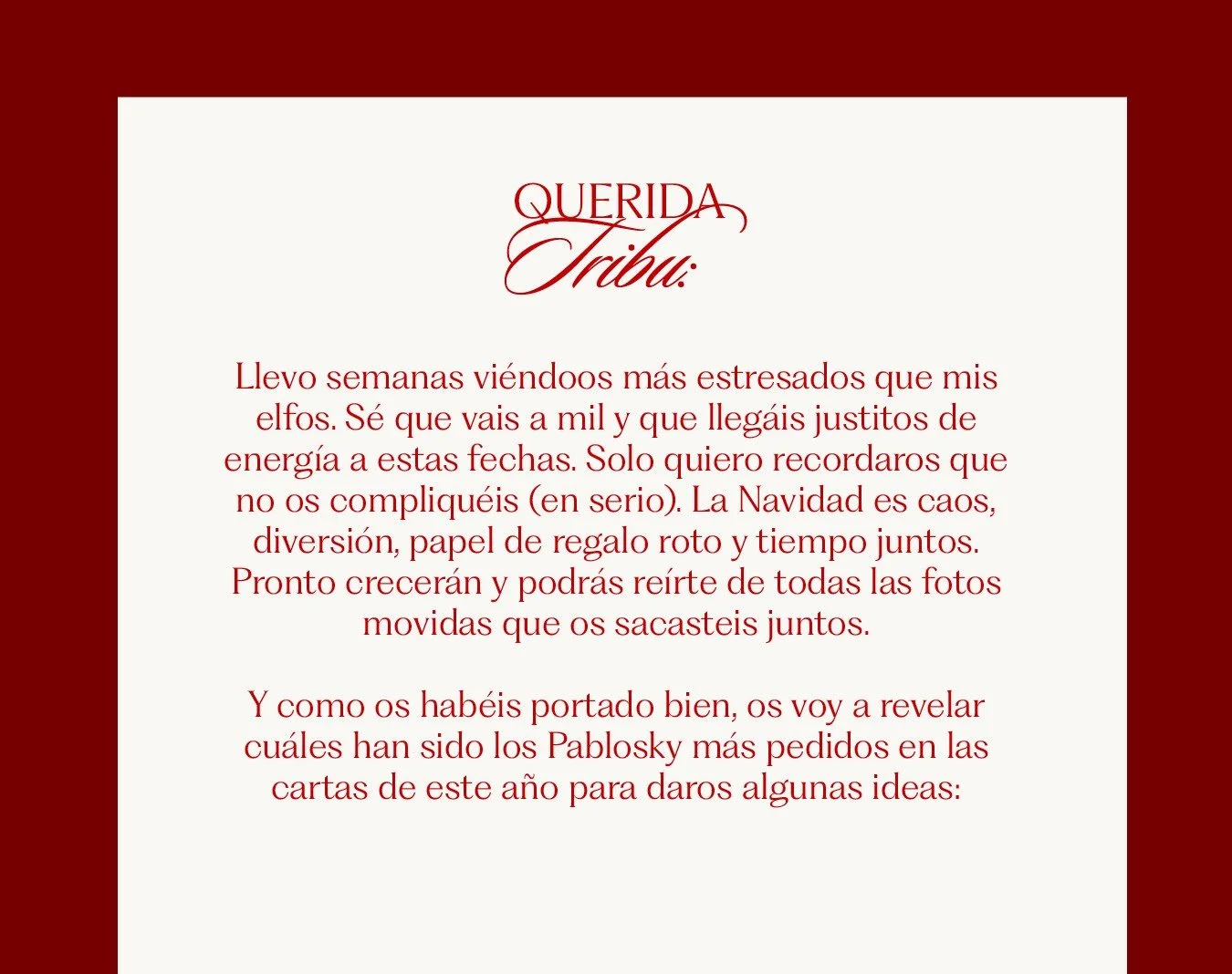 A partir del concepto y la estrategia desarrollados por Morbo y We Are Cursiva, me encargué de crear contenido para Instagram y mailings para su comunidad: La Tribu. El reto: adaptar la voz de la marca a un tono más gamberro y desenfadado, sin perder su puntito cercano y familiar.